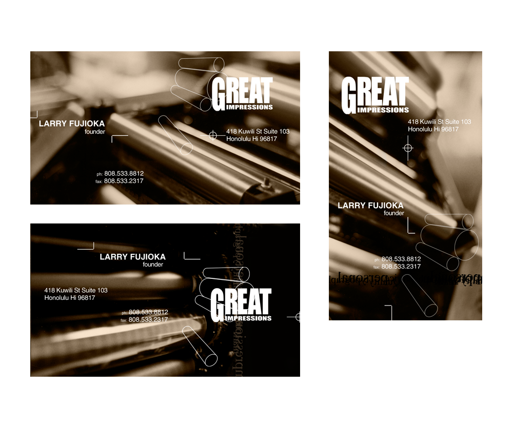 Point b designed business cards for Great Impressions, a well-known printing press company based in Hawaii. The design reflected the precision, elegance and care that the company was known for.